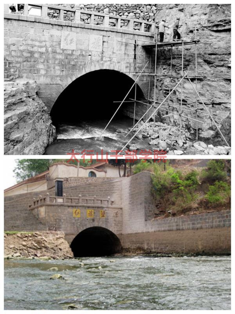 一、紅旗渠源和渠首攔河壩。位于山西省平順縣候壁水電站下約600米處,由攔河溢流壩、引水隧洞、引水渠、進(jìn)水閘、泄洪沖沙閘聯(lián)合組成渠道引水樞紐,為無(wú)調(diào)節(jié)河道自流引水。1960年2月10日動(dòng)工,同年5月1日竣工。