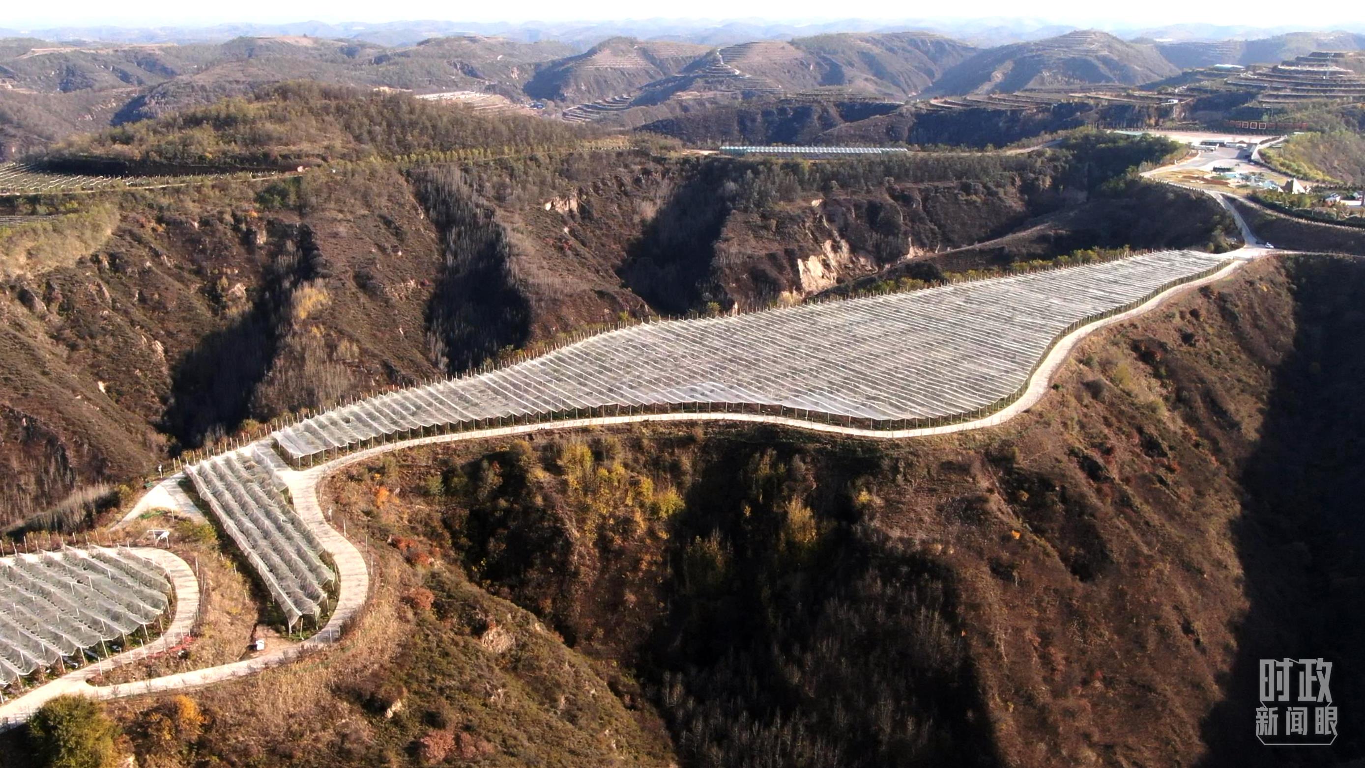 △南溝村果園,蘋果樹頂是一層防雹網(wǎng)。